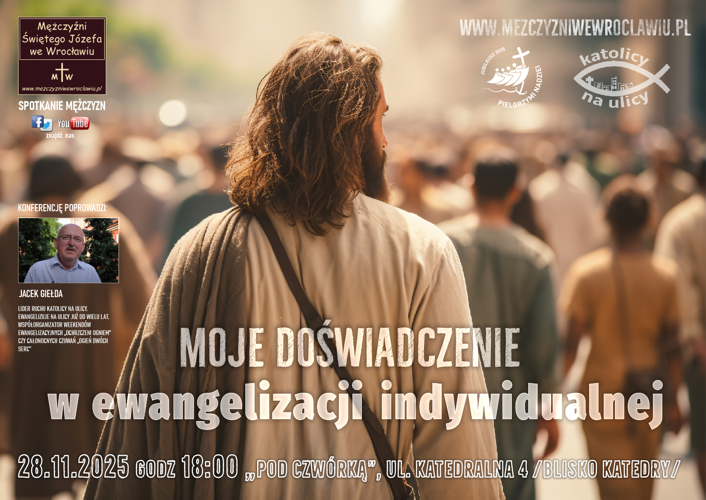 Jacek Giełda Lider ruchu Katolicy Na Ulicy. Ewangelizuje na ulicy już od wielu lat. Współorganizator weekendów ewangelizacyjnych „Ochrzczeni Ogniem” czy całonocnych czuwań „Ogień Dwóch Serc”